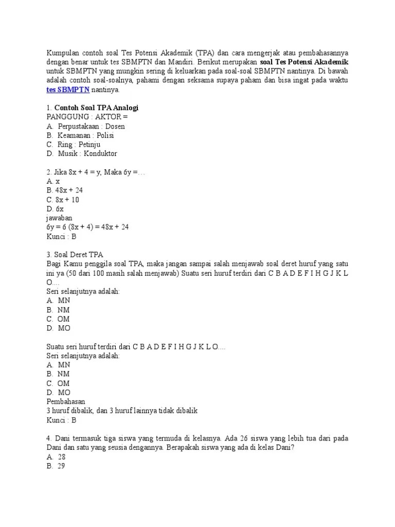 Dengan benar untuk tes sbmptn dan mandiri. Soal kunci jawaban latihan tpa tes masuk sma ujian potensi akademik 2021/2022 sistem ppdb online. Contoh soal tes tpa bank indonesia. Tpa menjadi salah satu ujian yang membutuhkan strategi dalam menjawabnya. Paket soal sbmptn, mata pelajaran ipa tkdu/tes potensi akademik.